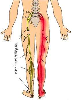 Sur le plan anatomique, les douleurs sciatiques (ou sciatalgies) correspondent à une compression de la racine antérieure, motrice, du nerf sciatique. La douleur vive est ressentie le long d’un des 2 nerfs sciatiques. Situés à l’arrière de chacune des jambes, ce sont les nerfs les plus volumineux de l’organisme. Ils rejoignent la colonne vertébrale au bas du dos, à la hauteur des vertèbres lombaires et sacrées (tout juste au-dessus du coccyx). La douleur atteint principalement la fesse et la cuisse, et s’étend souvent jusqu’au pied. Le plus souvent, la douleur ne touche qu’un seul côté du corps.