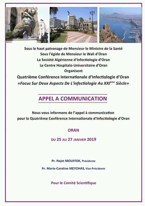 La Société Algérienne d'Infectiologie d'Oran et le CHU d'Oran organisent, la 4ème conférence internationale d'infectiologie d'Oran, qui se tiendra du 25 au 27 Janvier 2019